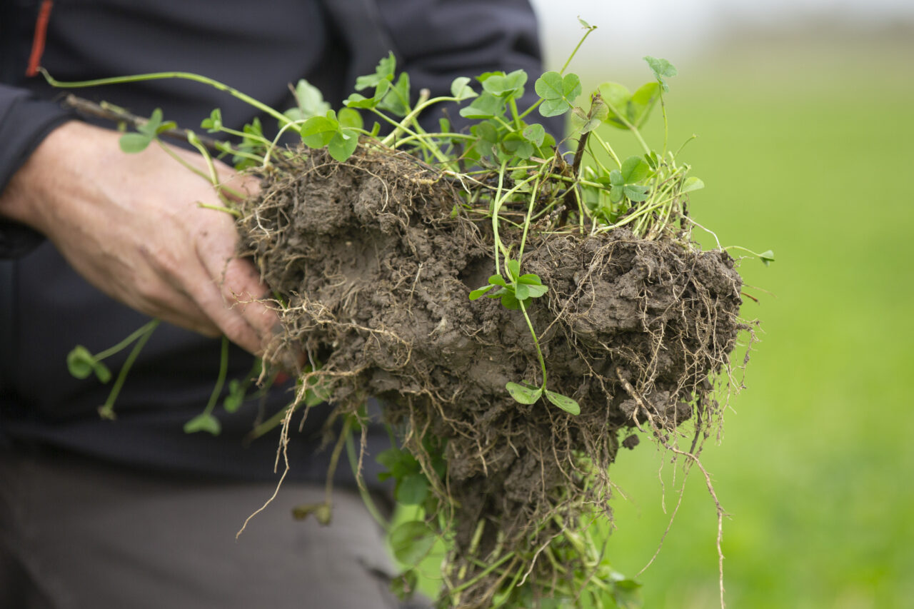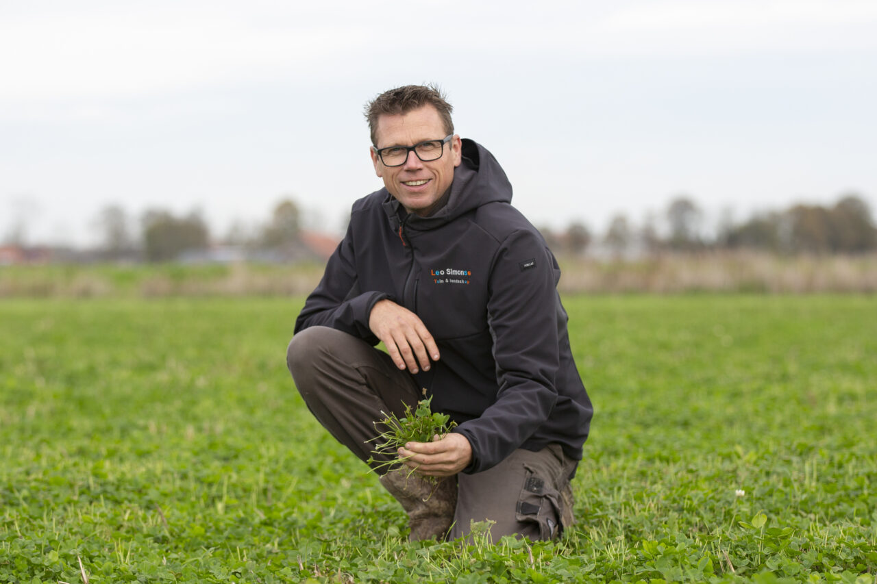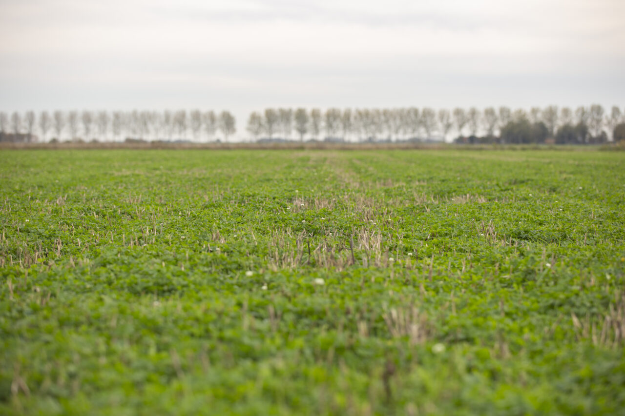 “Het is heel handig dat de klaver meteen al op het land staat na de oogst van het graan. Zo is er geen roering in de grond voor het zaaien van de groenbemester, en creëer je geen kiembed voor zaadonkruiden. Daarnaast wordt de stikstof meteen vastgelegd in de grond door de volwaardige mat met klavers”.